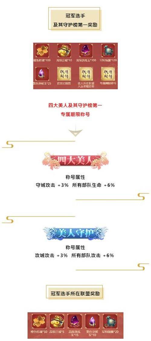 四大美人及其守护榜第一将会获得珍稀游戏道具,以及万众期待的专属期限称号“四大美人”和“美人守护”,所在的联盟还会获得海量的道具奖励。