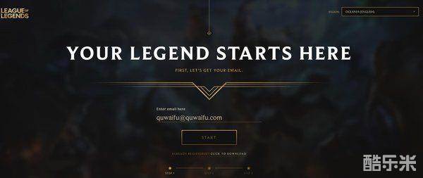 1、首先玩家进入拳头官网后,点击右上角play now进入注册页面。进入注册页面后可以先点击右上角的地区将其切换至东南亚OCEANIA,然后点start。