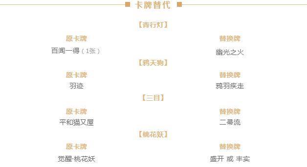 四名式神算上三目的线索牌都有过牌能力,使得卡组很少面临手牌资源不足的窘境。桃花妖提供的恢复和复活都是单核心卡组需要的辅助手段。青行灯提供额外鬼火资源让己方有更多鬼火来做委托任务。鸦天狗则是灵活地使用法术牌控制场面,配合自己的觉醒能力可以达到控场解场的作用。