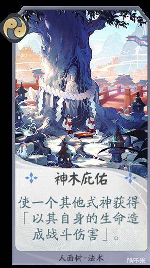 神木庇佑的效果只要不气绝则一直存在,很适合生命值高的式神。如跳跳弟弟可以配合两个瞬发战斗牌秒人,妖刀万华直接8力量进攻,大家也可以给鬼切的复仇之刃。当然神木庇佑除了给自己的式神,也可以给敌方血量较低(无形态/无恢复)的式神,因为神木庇佑的效果根据当前血量多少计算,且战斗牌的攻击加成也是无效的。