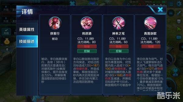技能解析:李白一定时间内进行多次普通攻击,对防御塔的攻击除外,则可以提高自身的攻击力并且解除三技能的使用限制。