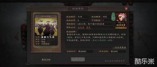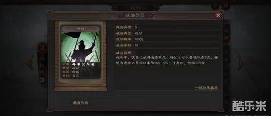战斗中,使自己获得连击状态,每回合可以普通攻击2次,并使普通攻击目标统率减低(满级为25点),可叠加,持续2回合。