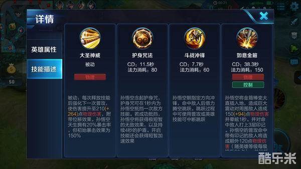 技能解析:孙悟空放出技能后普通攻击伤害更高,孙悟空初始暴击率就远高于其他英雄。使用技能时孙悟空需要利用好自己的被动技能,增加自己的输出伤害。