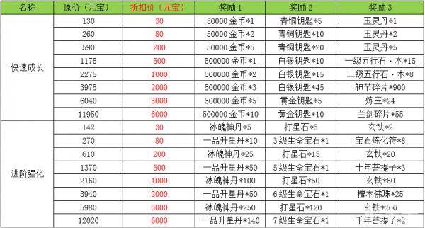 活动内容:玩家可以通过较低的元宝获得更高价值的成长道具和强化道具。