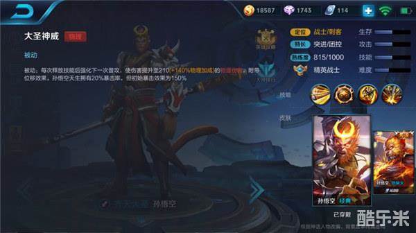 被动-大圣神威:释放技能后强化下一次普攻伤害并附带位移效果,并让孙悟空天生自带20%暴击率。孙悟空主要的输出手段就是释放技能后加强的普通攻击,可以说被动的存在奠定了孙悟空高爆发刺客的地位。