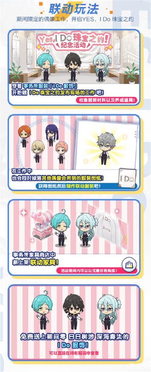 在正式公测后,《偶像梦幻祭2》游戏内将会有期间限定偶像工作限时登陆!制作人们可以通过完成【I Do珠宝之约发布现场的工作】,收集服装材料以及养成道具;在工作中,也会同时掉落小偶像们会用到的服装图纸,制作人们活动图纸后就可以制作联动服装;在事务所家具商店中,也会有联动家具全新上架,玩家们可以以优惠价格购买。在活动期间,制作人们均可免费获得朔间零、日日树涉、深海奏汰的I Do服饰,制作人们可以直接在持有服装中查看。