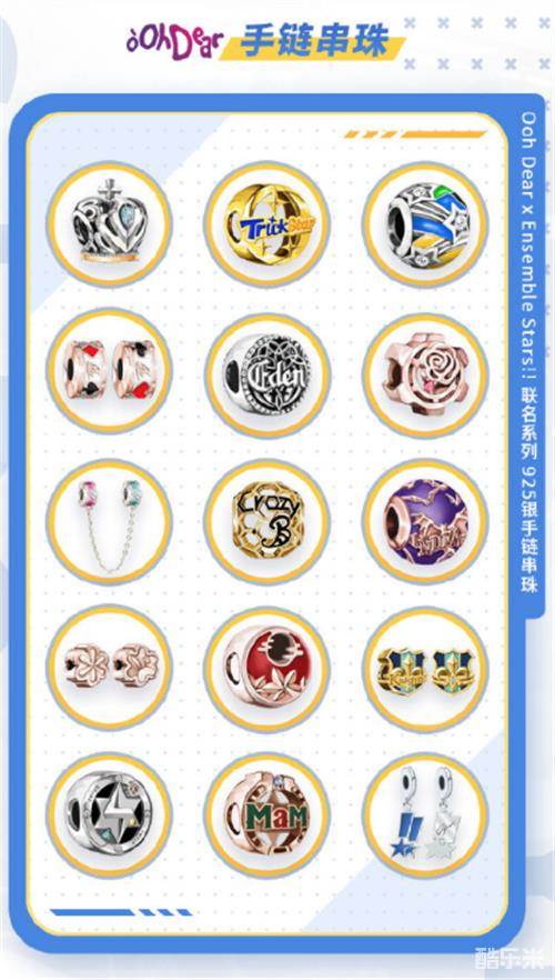 此外,《偶像梦幻祭2》与 IDo 携手推出Ooh Dear手链串珠15枚(14款队伍款+1款定制款,支持刻字),以不同的材质和宝石诠释不同风格的偶像们。每个组合不同的风格特色,与璀璨优雅的华美珠宝相结合,彰显了组合独特的魅力。