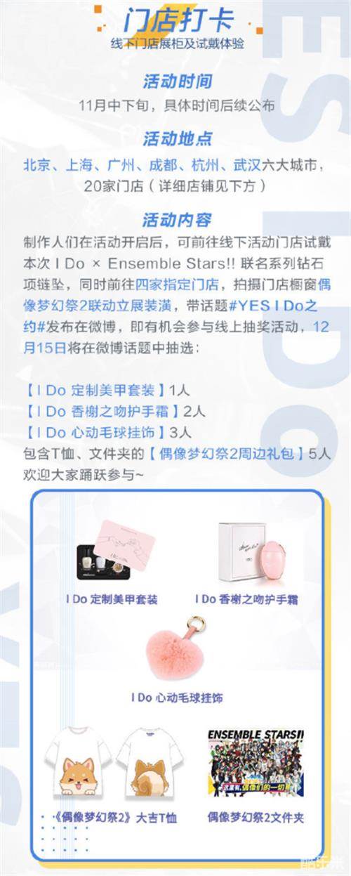 想要线下感受定制珠宝的魅力,立刻来指定门店打卡吧!六大城市20家门店实物试戴,切身感受珠宝的优雅,拍照打卡还可参与赢大奖。制作人们可前往20家指定门店试戴I Do × Ensemble Stars!! 联名系列钻石项链坠,同时前往四家指定门店,拍摄门店橱窗偶像梦幻祭2联动立展装潢,带话题#YES I Do之约#发布微博,即有机会获得I Do定制美甲套装、I Do心动毛球挂饰、I Do香榭之吻护手霜,以及偶像梦幻祭2 周边礼包。