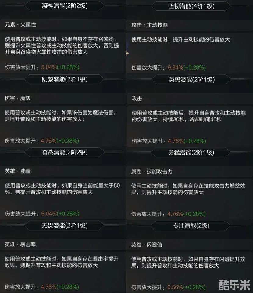专注潜能看个人喜好,火女这套搭配本来就有闪避值提升,直接选闪避值更好。无畏潜能适合选暴击率,火女天赋就有暴击提升,要是选能量回复的话,副英雄就要选傀儡,冰女队伍天赋虽然有能量回复,但不是持续效果,所以不能选。
