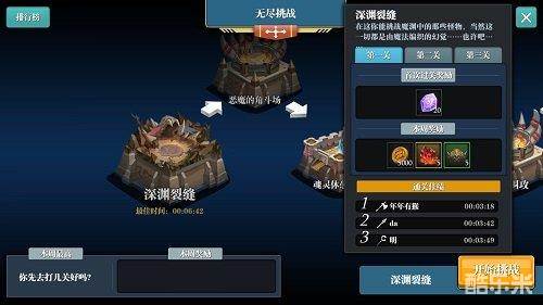 在无尽挑战中,共30个大关卡,每个大关卡下会有3小关,需要一层一层地挑战自我。每周日晚12点结算当周奖励,包括金币、强化石和黄金印章。下一周再回退到初始关卡-深渊裂缝,开始新一周的挑战。