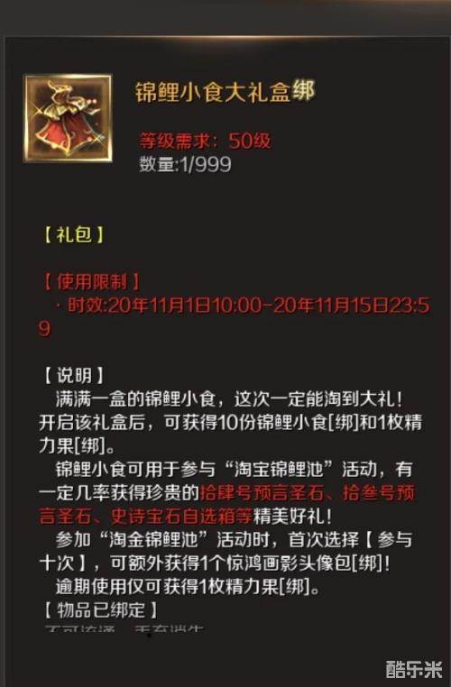 11月1日10:00-11月15日23:59期间,神选者携带“锦鲤小食”参与“淘金锦鲤池”活动。将有一定几率获得珍贵的拾肆号预言圣石、清影婵娟礼盒、死神1-4随机·极、冥王1号自选·极、枭狼1号自选·极等丰厚好礼!