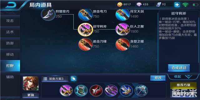 巡守利斧是打野英雄的首选装备之一,提升对野怪的伤害、增加击杀野怪获得的经验、获得寒冰惩击效果,在击杀野怪的同时还能不断提升自身最大生命值。在一次调整后,李白每一级的基础攻速成长被提高了1%,所以现在选择巡守利斧来提升容错率是一个更具性价比的选择。