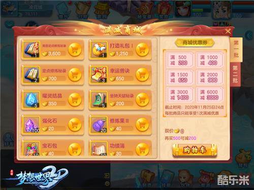 恰逢双十一,梦想世界3D推出了满减商城,最高可享受满6000-3000的5折优惠。在活动期间,玩家在满减商城中消费达到对应额度,将享受满减优惠。