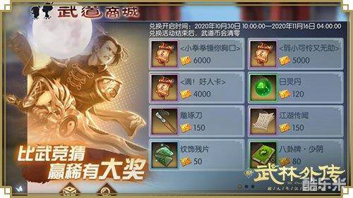 赛事进行时,竞猜玩法限时开启!玩家们可以在【九州武会】活动界面参与竞猜,参与即可获得武道币。武道币可以在武道商城兑换专属聊天框、称号、各类道具!欣赏群侠对战,领取稀有奖品,做一个快乐的吃瓜群众~