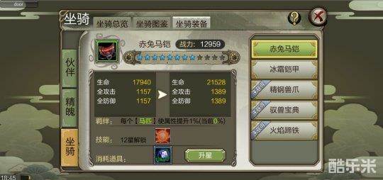 新资料片更新后,将在伙伴-坐骑中增加坐骑装备系统,坐骑装备有赤兔马凯、精刚兽爪、驭兽宝典、火焰蹄铁、冰霜铠甲,消耗材料对坐骑装备升星,升至12星后,会激活专属坐骑技能,最多能激活3个,可以大幅提升自身战斗力哦。坐骑装备属性将全部加成至人物身上,无论是否骑乘坐骑。坐骑分为马匹、野兽、神兽、奇物四种类型,坐骑装备根据拥有的特定类型永久坐骑的数量提升属性加成百分比。现有的五个坐骑装备,1个预售可得,2个新副本“四绝夺魁”获取,2个可在商城购买。
