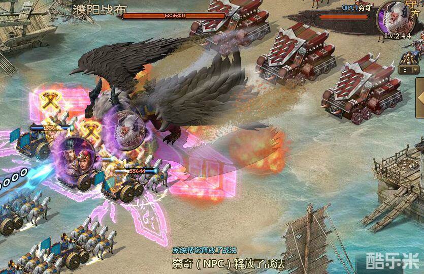 第一次攻打244级副本时,穷奇兵力为1110万,攻防血特别高,跨服争霸赛16强选手去打,战车每次也只能打掉3点血;战车破掉、武将本体去打时候,虽然比之前打的多一点,但总量也很少,16强选手5个武将都拿不下穷奇。后面4个普通NPC攻防血较低,与之前的242、243级副本NPC差距甚远。