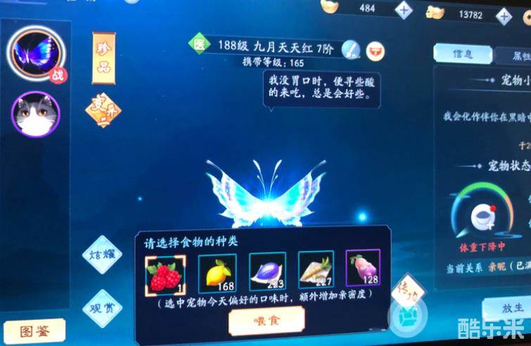 点加号投食时宠物会说话 比方我的蝴蝶说喜欢酸的就用酸的