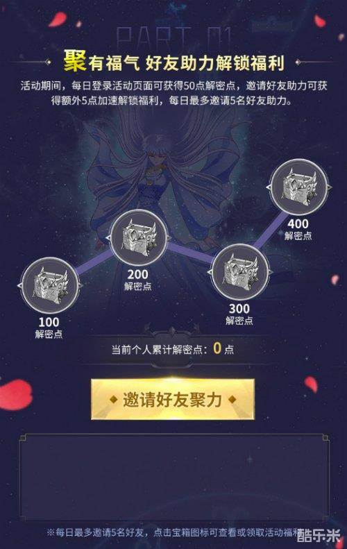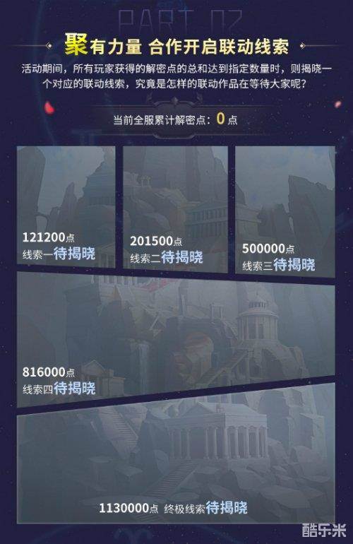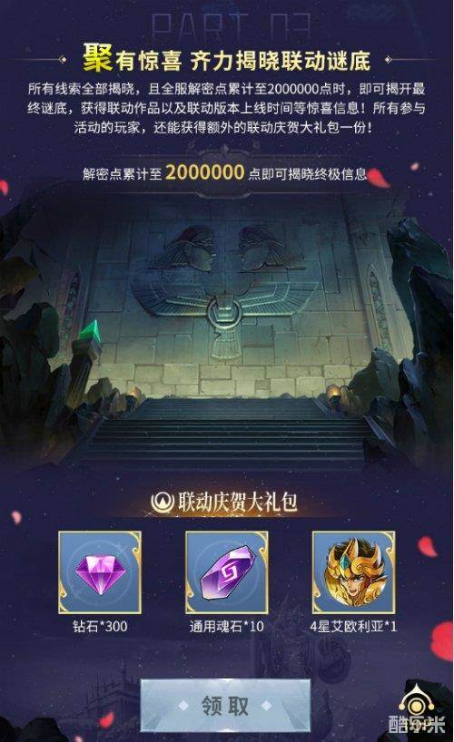玩家每天登录活动页面聚力小宇宙可获得解密点,当所有玩家的解密点总和达到一定值时,可以解开一个联动线索,解开所有线索后,不仅联动作品的真面目会被揭开,参与活动的玩家还能获得联动庆贺豪华礼包哦,快叫上好友一起助力参与吧!