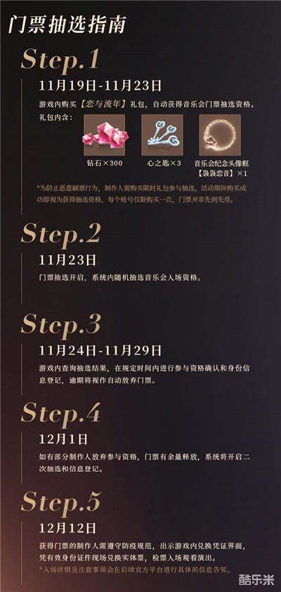 音符间的纪念,邀请你亲身聆听。恋与制作人三周年音乐会线下参与方式首次公开,此次音乐会将不会对外售票,所有门票将通过【邀请】与【抽选】两种方式送出。截止于今年11月6日,游戏VIP认证达到LV7的制作人均可获得邀请。未收到邀请的制作人,在游戏内购买音乐会活动专属礼包(含钻石、心之匙、音乐会纪念头像框),即可参与限时门票抽选活动,有机会获得音乐会门票,亲临现场享受三周年音乐盛会。