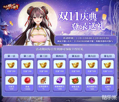 11月11日6:00-11月18日5:59期间,玩家每日登录游戏可领取丰富资源,累计登录7天更可获得1111元宝、红将令等超值福利!