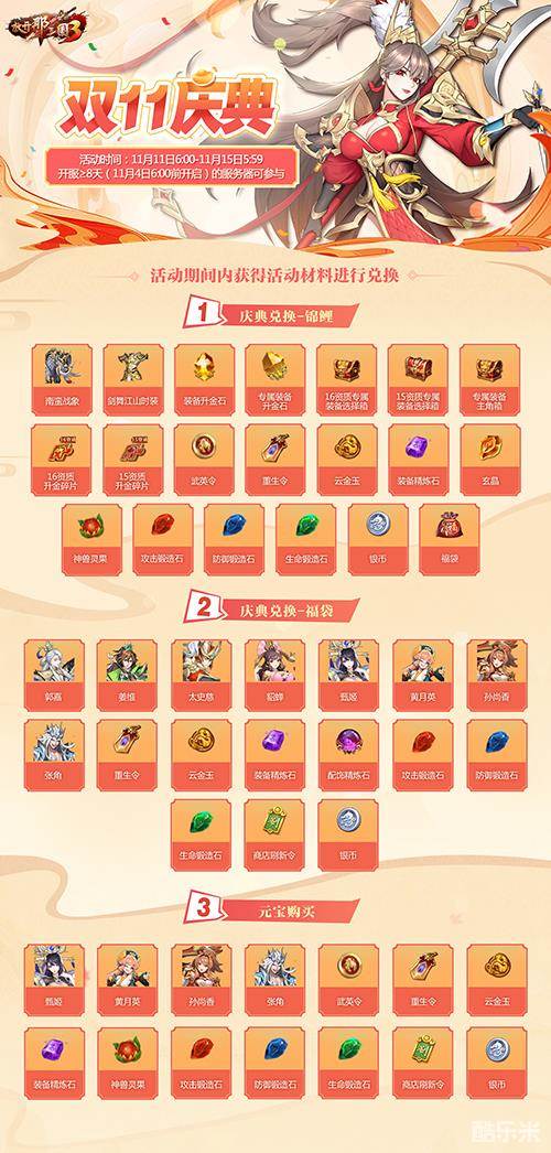 11月11日6:00-11月15日5:59期间,玩家参与活动获得道具「福袋」、「锦鲤」。「福袋」可用于兑换强化阵容必备的稀有资源,为玩家打造强力阵容推波助力!「锦鲤」可用于兑换全新红色坐骑-南蛮战象、主角统领时装、武将选择箱等超值壕礼,助玩家兵强马壮驰骋三国!
