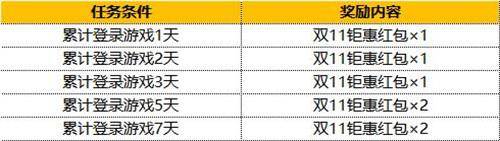 活动期间,累计登录游戏达到指定天数,即可获得双11钜惠红包!使用红包有机会可以从钻石×50、钻石×100、钻石夺宝抵用券×1、钻石夺宝抵用券×5等奖励中任意选择一种道具。免费福利,岂容错过。