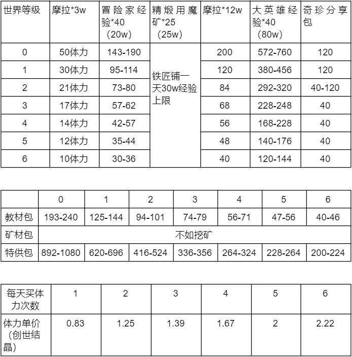 世界等级越低,每日购买体力越多玩家购买收益越高。由于通过挖矿、蹭矿每天可以在铁匠铺获取30w武器经验,因此并不推荐购买矿材包,而不挖矿的小伙伴可以酌情选择购买。