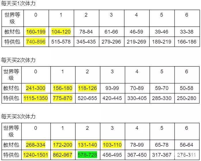 ※ 黄底指收益较大,绿底指购买收益基本与购买体力持平