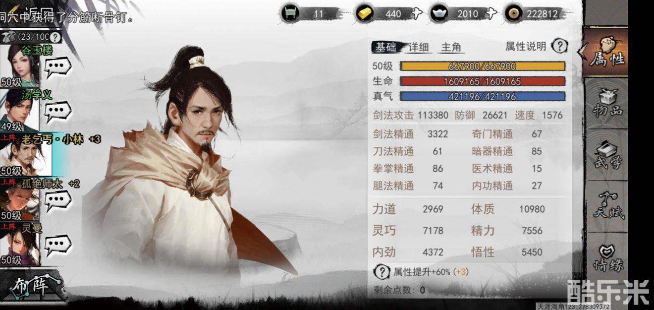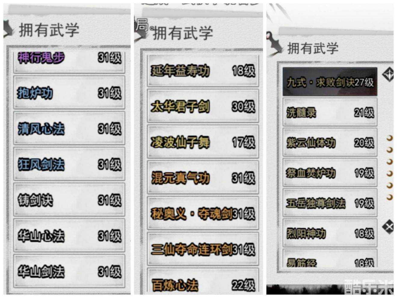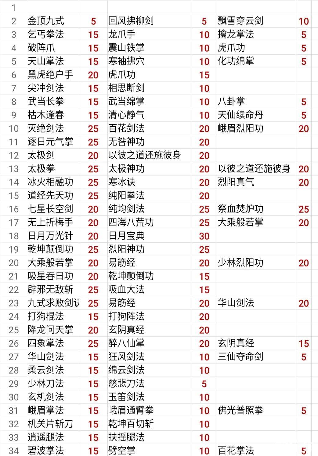 具体的看图,我就谈谈我找到的小技巧。五岳现在有金蛇剑以后不缺后期伤害,就缺怎么挺到后期破甲叠起来,烈阳神功必带(推荐剧情队友每个也学个); 后期五岳独尊和九剑,九剑单体强带随机封印,我的有九剑奥义但秘籍等级不够没触发(易筋经、华山、九剑),五岳独尊剑打群伤快还自身加buff,推荐打BOSS九剑,刷副本五岳。