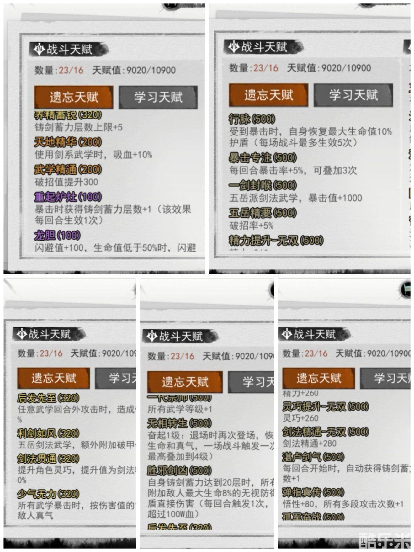 铸剑要走的话初始铸剑上限五层,要一个加上限的奥义,还有两个内功加上限才能到20层上限,才能触发胜邪剑凶天赋,我还带了个每回合自己暴击加一层铸剑的天赋,五岳独尊20级自带每回合加2层,剑气天赋每回合加一层,百炼内功每回合1层,一回合6层(其实实战会更快),第四第五回合就能触发胜邪剑凶天赋。