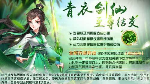 活动期间,开启5日至尊结交!超凡入圣资质,刀剑类侠客——青衣剑仙,专属灵力可攻可守!魔道至尊资质,内劲类侠客——阎罗。同期圣·谷月轩也将一同返场!每次至尊结交均有机会获得至尊令,可用于至尊商店兑换3种侠魂!每次结交还有机会获得红宝石等稀有资源。
