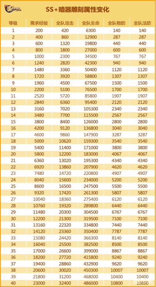 升星不同,SS+暗器属性也有较大幅度提升,下图表可见升星对属性的加成影响: