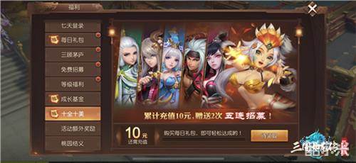 完成爵位任务即可免费获得解封神将魔·夏侯渊,充值1元即得最强辅助神将仙·吴国太,自动复活带无敌,更额外加送绝版超萌金将典满、宝石大礼包等豪华道具奖励。充值满10元即获赠10连招募武将机会,更有#G紫龙玉珏、秘宝钥匙、萌萌兔耳朵#l等价值300元大礼包等你来拿!