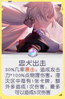 终结技能:30%几率暴击。造成攻击力*100%点物理伤害。湮灭区中每有1张卡牌,额外多造成1次伤害,最多可以造成5次伤害。
