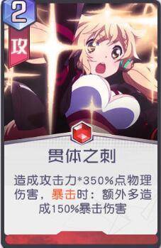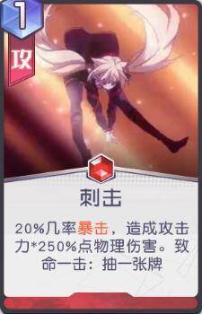 技能一:20%几率暴击,造成攻击力* 250%点物理伤害。致命一击:抽1张牌。