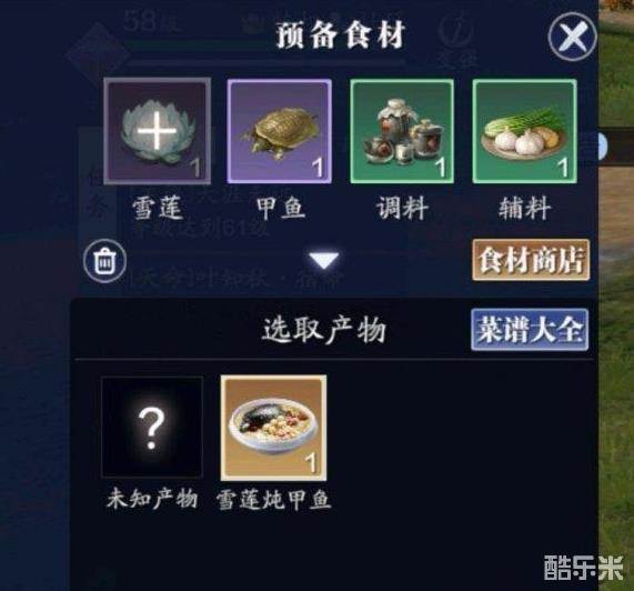 雪莲炖甲鱼这种是需要在身份商店点里购买食谱的,类似的食谱还有很多,建议每次厨师等级提升一些后多去逛逛身份商店,没准有意外收货哈。没买食谱是做不出的。