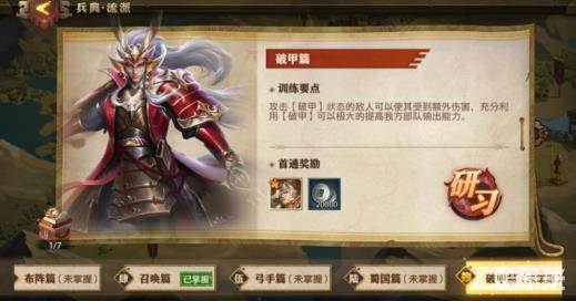 进入游戏首页,点击【演武场】,选择【流派兵典】,拉到最右边,会看到一个帅气的军师周瑜,不仅为玩家点出了破甲流的训练要点,还准备了丰厚的奖励,张角碎片5个和银币若干,点击【研习】。