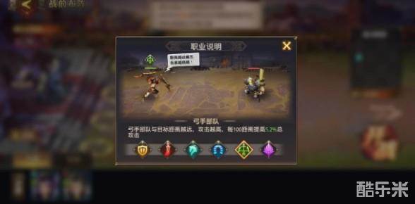 弓手:弓手部队与目标距离越远,攻击越高,每100距离提高5.2%总攻击。