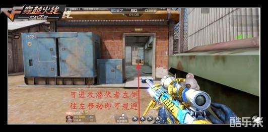 最后给大家分享三个非常实用的冷门点位,第一个是潜伏者左侧屋顶后面的铁皮管,蹲在这上面可以轻松击杀从左边攻过来的敌人。这个位置居高临下,具有极大的对枪优势,可以有效保障队友侧身的安全。需要注意的是,在这里一定要蹲下作战,否则会被中间屋子里的敌人透过屋顶上的破洞击杀。
