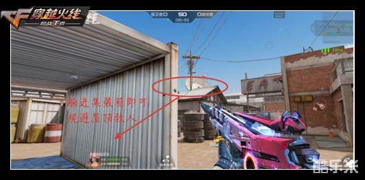 第二个点位是潜伏者家里的蓝色铁皮箱,这里具有先天的防御优势。铁皮箱无法被穿透,就像是一个巨大的乌龟壳一样,躲在里面稍微一缩就可以避过敌人的子弹。这里也可以打掉左侧攻过来的敌人,还不用担心被屋顶的敌人击杀,和上面那个点位的队友互相配合,左侧固若金汤。