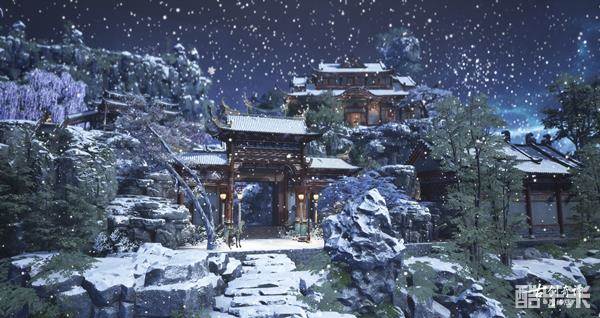 建筑师“コンチェルト”铸造了一座风雪弥漫的“寄啸山庄”,楼台门廓沾染了飞雪霜白,山庄在雪色中显得静谧美好。