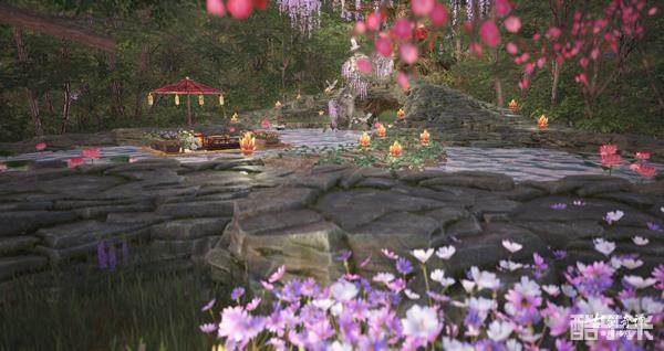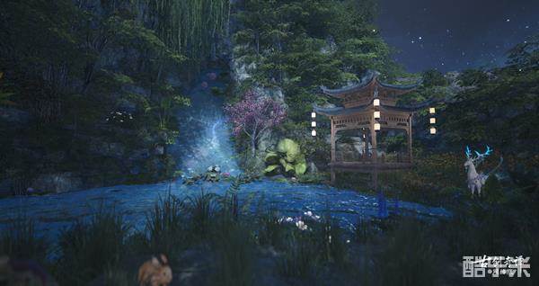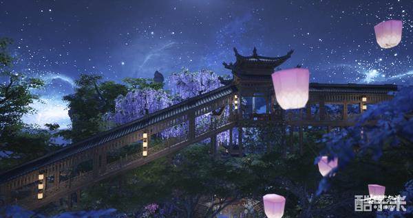 顺着鲜花簇拥的石蹊小路前行,就来到了建筑师“乐西泡泡糖”的仙府作品“灯火阑珊处”。花树翠竹环绕着水榭楼台,浮灯点点,如梦似幻。