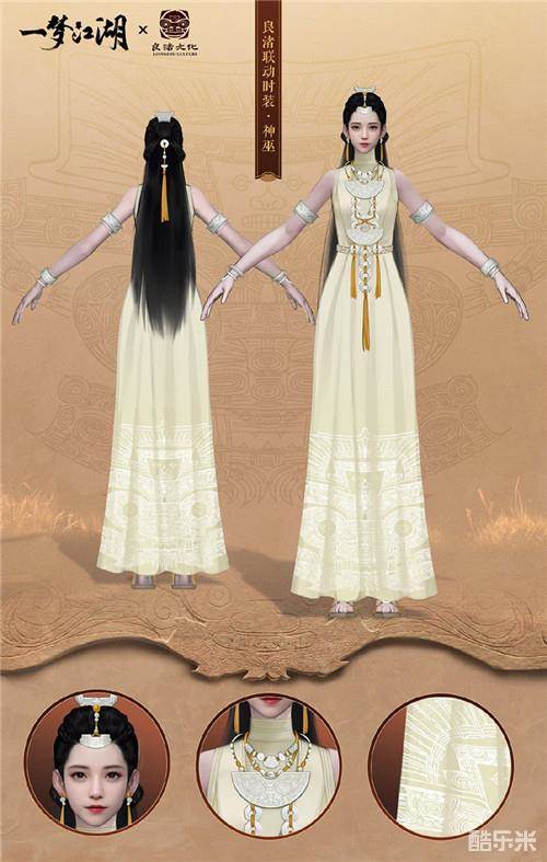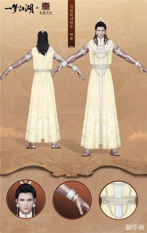 在《一梦江湖》X良渚的这套联动款时装中,着重使用了代表良渚文明标志性的“神人兽面纹”,不同体型的少侠的时装下摆上,都用刺绣装饰了大幅的神人兽面纹。而从良渚器具及相关资料显示,良渚人在信仰和礼乐祭祀等重大事件方面,会选择神巫祝祷,祈愿上天福佑。故云锦楼大师傅在设计这套时装的时以神巫为主要形象,融合了良渚文明的各大元素特征,同时寄托了祈愿美好的愿望,推出了这套联动款时装:“神巫”。