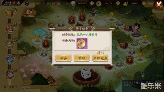 游戏玩法十分简单粗暴,只需要玩家掷骰子即可,但在棋盘上会遇到各种各样的情况,每个格子都会触发随机事件,这些事件包括:铜钱奖励、元宝奖励、战斗、悬赏任务、转盘、宝箱等。这里有玩家不经思考起来,这战斗和悬赏任务听起来肯定不简单啊,但实际上唐宫宝库玩法中的过程也十分轻松简单,自己打不过还可以招募打手前来战斗,悬赏任务也仅仅是我们每天都会做的日常任务相关等。