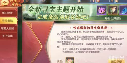 接见信使后,开启寻宝备战任务。每日完成讨伐魔将、家园互动、群雄逐鹿等玩法条件即可获得江南藏宝图碎片及将魂精华、随机良将将魂、随机名将将魂、三顾茅庐券等奖励。