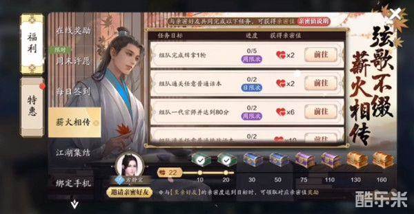 薪火相传是天涯明月刀手游中最近开启的一项活动,玩家们可以邀请亲密好友达成至亲好友关系,并可以通过若干任务来获得亲密值的加成。