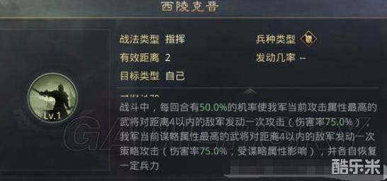 1.每回合50%机率使我军攻击最高的武将对距离4以内的敌军单体发动一次攻击,满级伤害率150%,并恢复一定兵力;