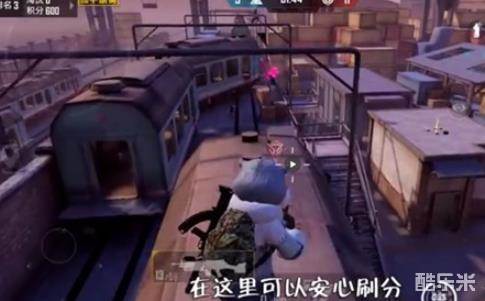 爬上箱子,尽可能往后站,对准第三节火车使用抓拍,就能爬到车顶。然后我们爬上钢管(注意:必须要先翻到外面才能爬上去),这里视野开阔,可以放心刷分。