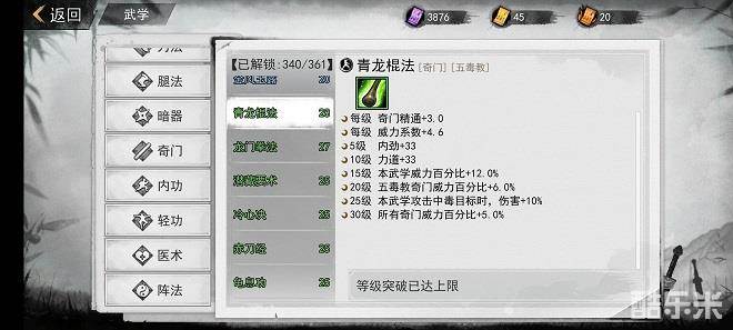 试过确实等级上限能突破25,华山已经25了,游戏里有等级加成封顶30,但是青龙棍法搞到28,游戏里就是33。