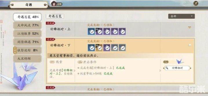 开启侠客:要解锁侠客叶知秋,需要完成针锋相对·上/下奇遇,奇遇自动触发,跟着跑即可;